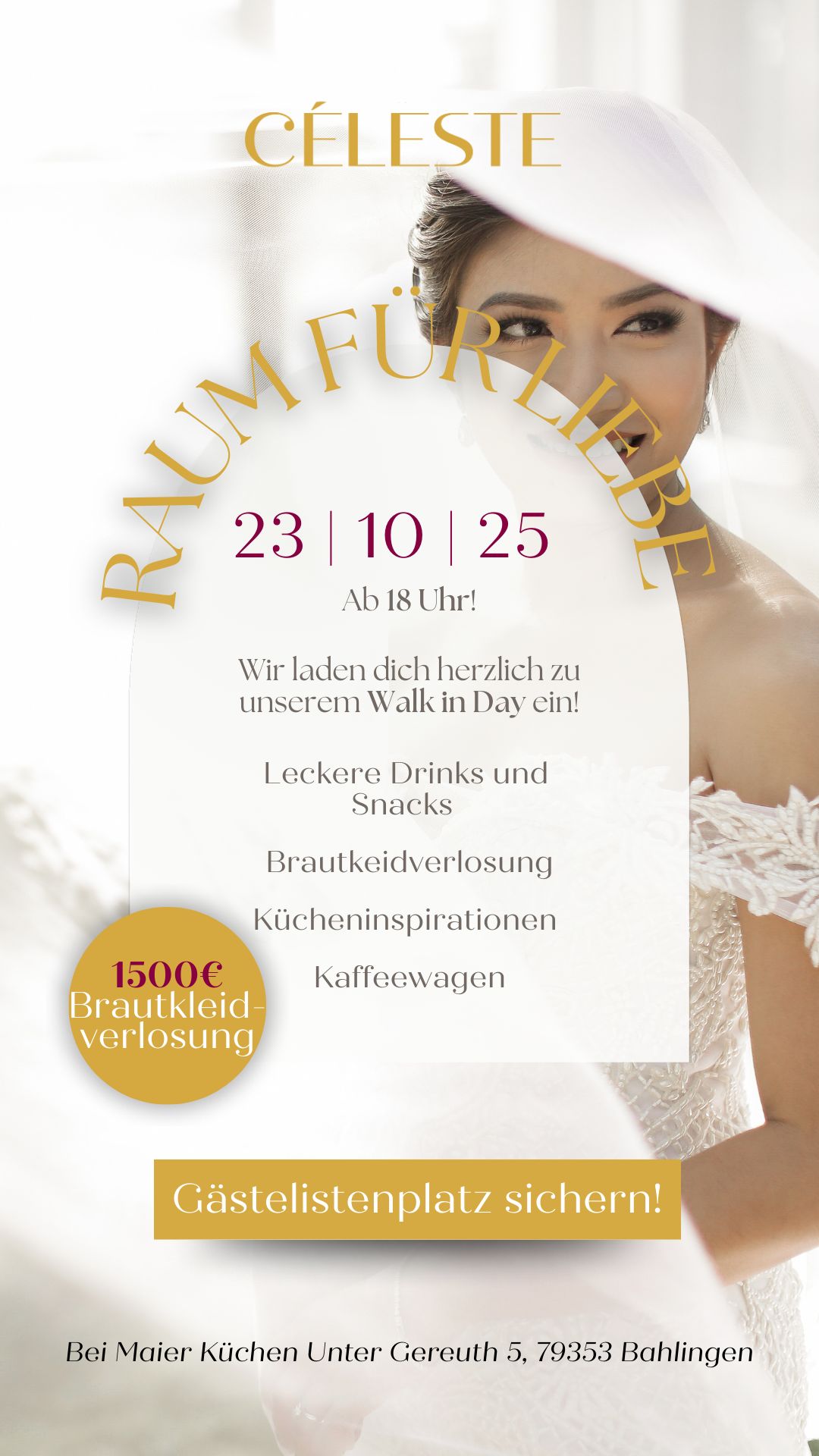 Am Donnerstag, den 23.10.2025, laden wir Dich herzlich zu einem besonderen After-Work-Event „Raum für Liebe“ ein – ein exklusiver Abend für alle Brides-to-be in einem ganz besonderen Ambiente. Nach dem „Ja“ beginnt Euer gemeinsames Leben – und Euer Zuhause wird zum schönsten Raum voller Liebe. Bei „Raum für Liebe“ kannst Du nicht nur traumhafte Brautmode entdecken, sondern auch Wohnwelten erleben, die Hochzeitsträume mit dem Gefühl von Zuhause verbinden.